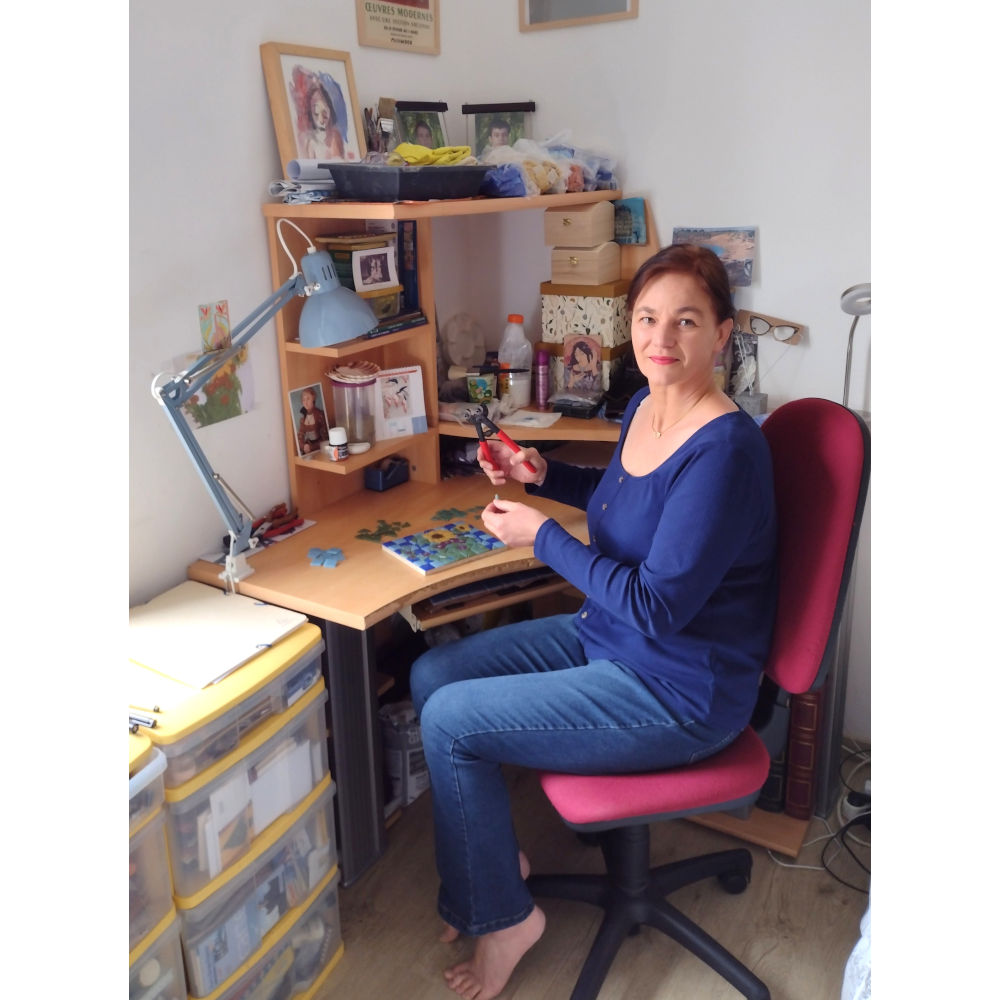 permettent désormais de me consacrer pleinement à mon activité d’artiste-auteur. Après avoir expérimenté au cours de ma vie avec divers modes d’expression plastique, auxquels je ne renonce pas, un coup de foudre relativement récent s’est imposé à moi, coup de foudre que je souhaite désormais privilégier : la mosaïque. Un rapport très direct avec la matière et les couleurs, qui d’une certaine façon imposent leur loi.