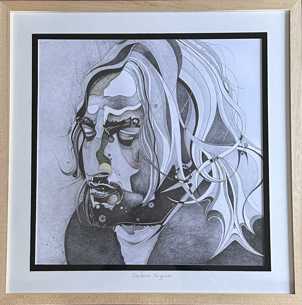 Graphite / graphite couleur  Image : 39,5 x 39,5 cm  Avec cadre : 53 x 53 cm  Passe partout blanc cassé / liseré noir  Cadre et verre professionnel / cadre bois clair