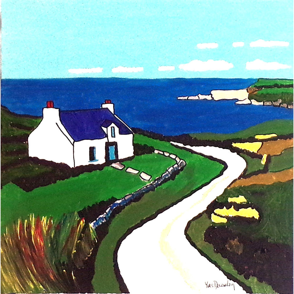 C’est une peinture au style naïf et coloré représentant un paysage côtier de Bretagne. Le titre « havre de paix breton », suggère une intention de dépeindre un lieu de calme et de sérénité. Le style est simple et direct, avec des contours marqués et des couleurs vives et non mélangées, ce qui est caractéristique de l’art naïf. L’ensemble dégage une impression de simplicité, de charme rustique et de lumière estivale