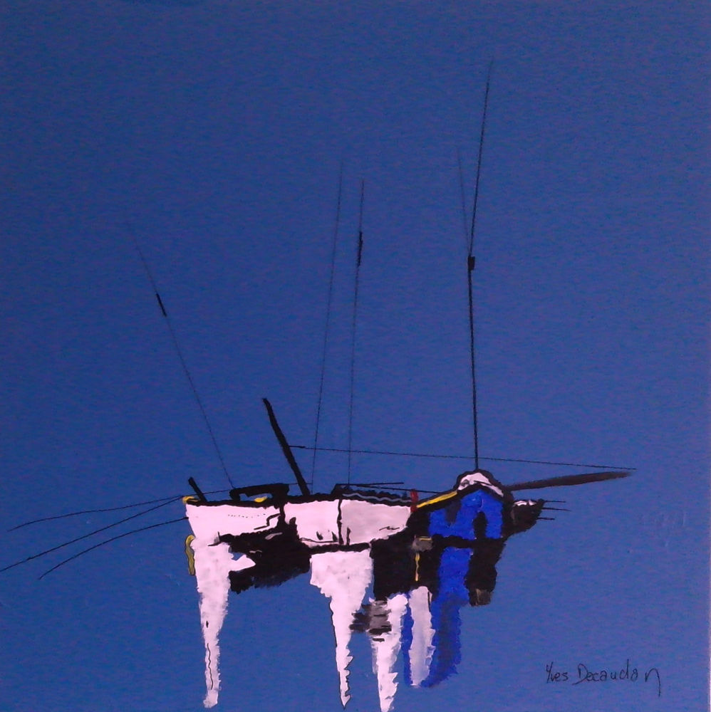 Cette œuvre, intitulée « Le Grand Calme » et signée par l’artiste Yves Decaudan, est une composition abstraite qui évoque avec subtilité l’univers maritime. Le tableau est dominé par un bleu profond et uniforme qui s’étend sur la majeure partie de la toile. Ce bleu évoque immédiatement l’immensité de la mer ou d’un ciel crépusculaire. Au centre, l’artiste utilise des contrastes forts avec du blanc pur, du noir et des touches de bleu cobalt plus vif. La structure centrale semble flotter, presque en apesanteur. Les formes blanches, avec leurs coulures verticales, suggèrent des reflets sur l’eau ou la coque d’un navire. La présence de lignes noires très fines et verticales rappelle des mâts ou des antennes de bateaux de pêche. Ces lignes étirent la composition vers le haut, créant un équilibre avec les masses plus denses situées au centre. Le titre « Le Grand Calme » résonne parfaitement avec l’économie de moyens utilisée. Malgré la déconstruction des formes, on perçoit une scène de port ou de bateau au mouillage. L’absence de ligne d’horizon renforce cette sensation de sérénité absolue et d’isolement, typique des moments de pause en mer.