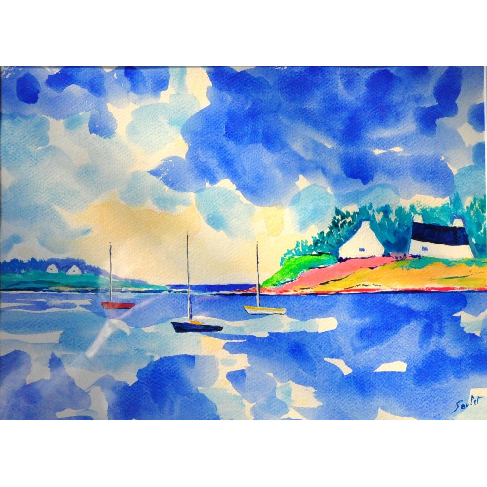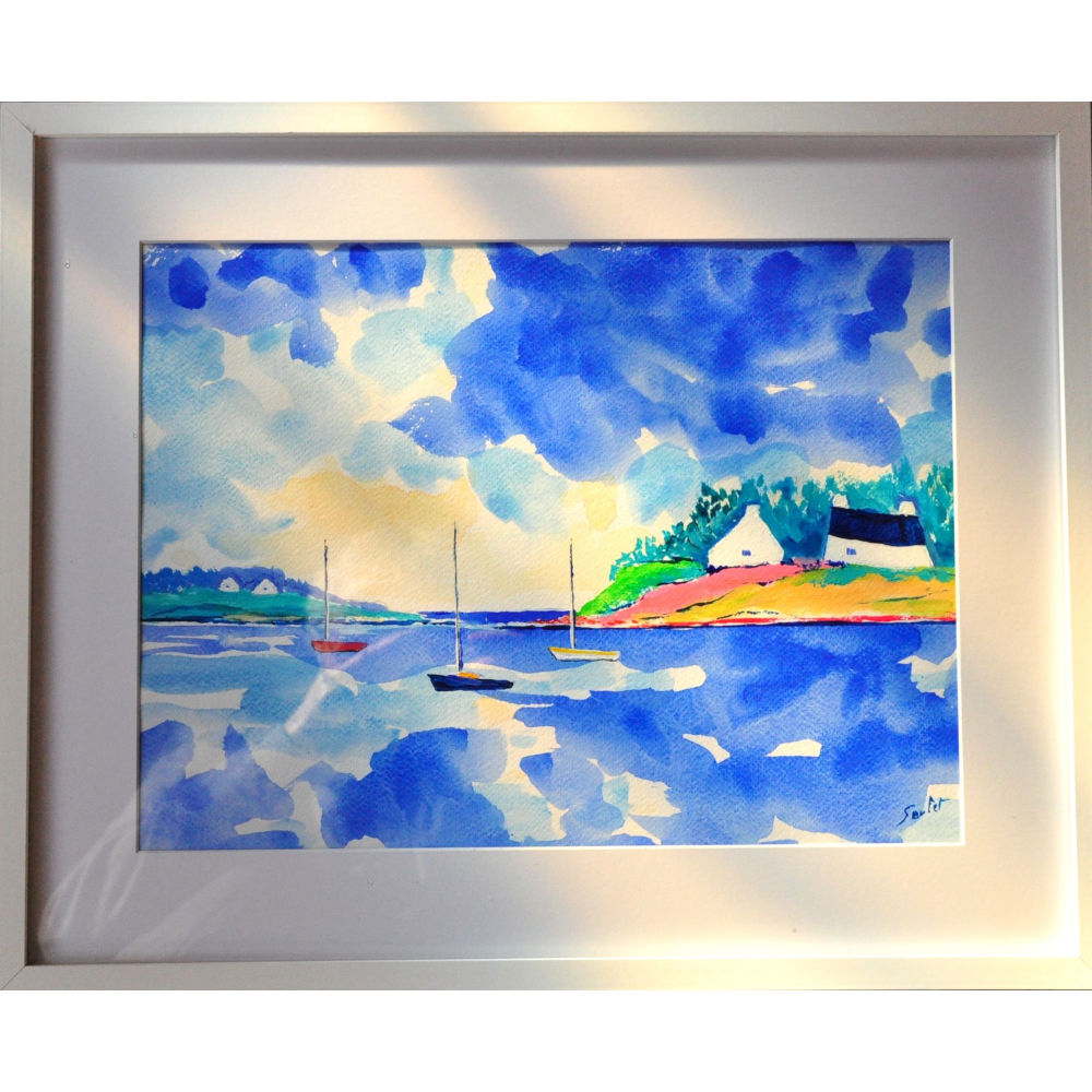 Aquarelle / acrylique sur papier Cadre bois laqué blanc.  40 x 30 cm