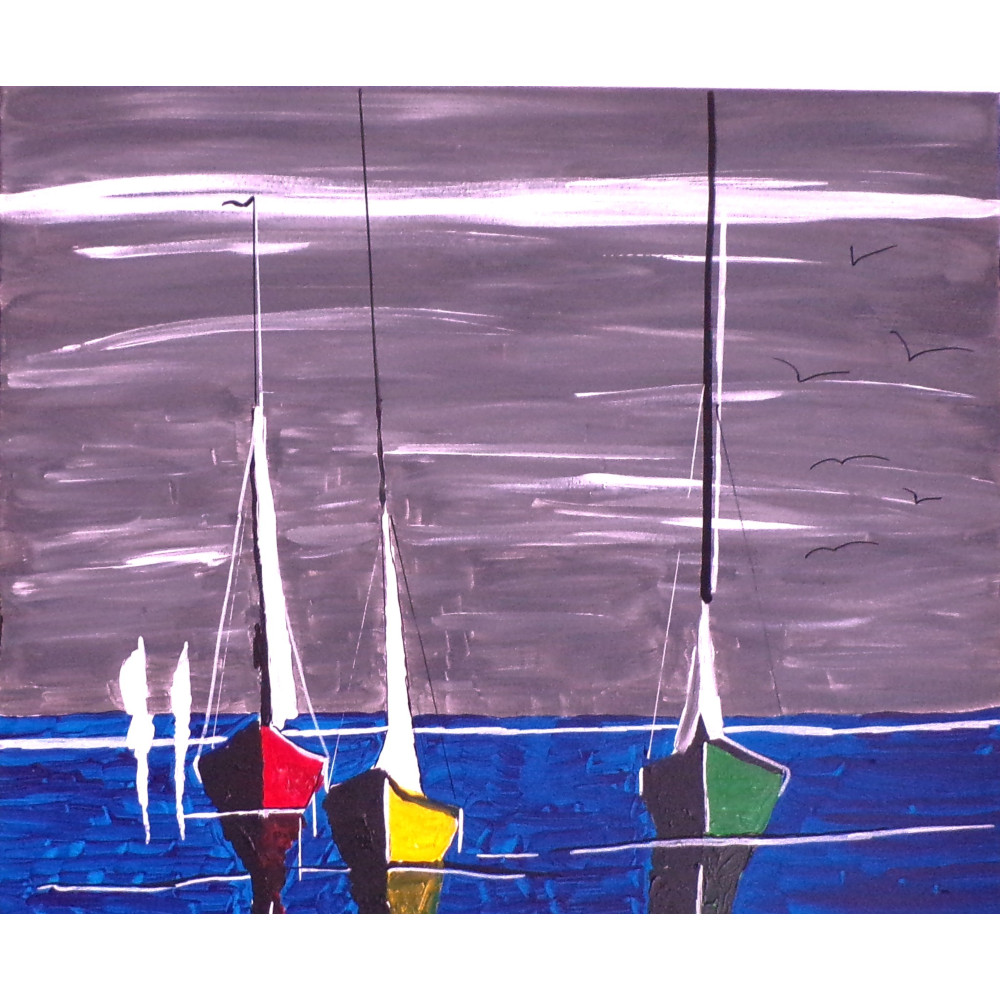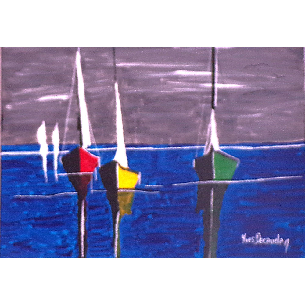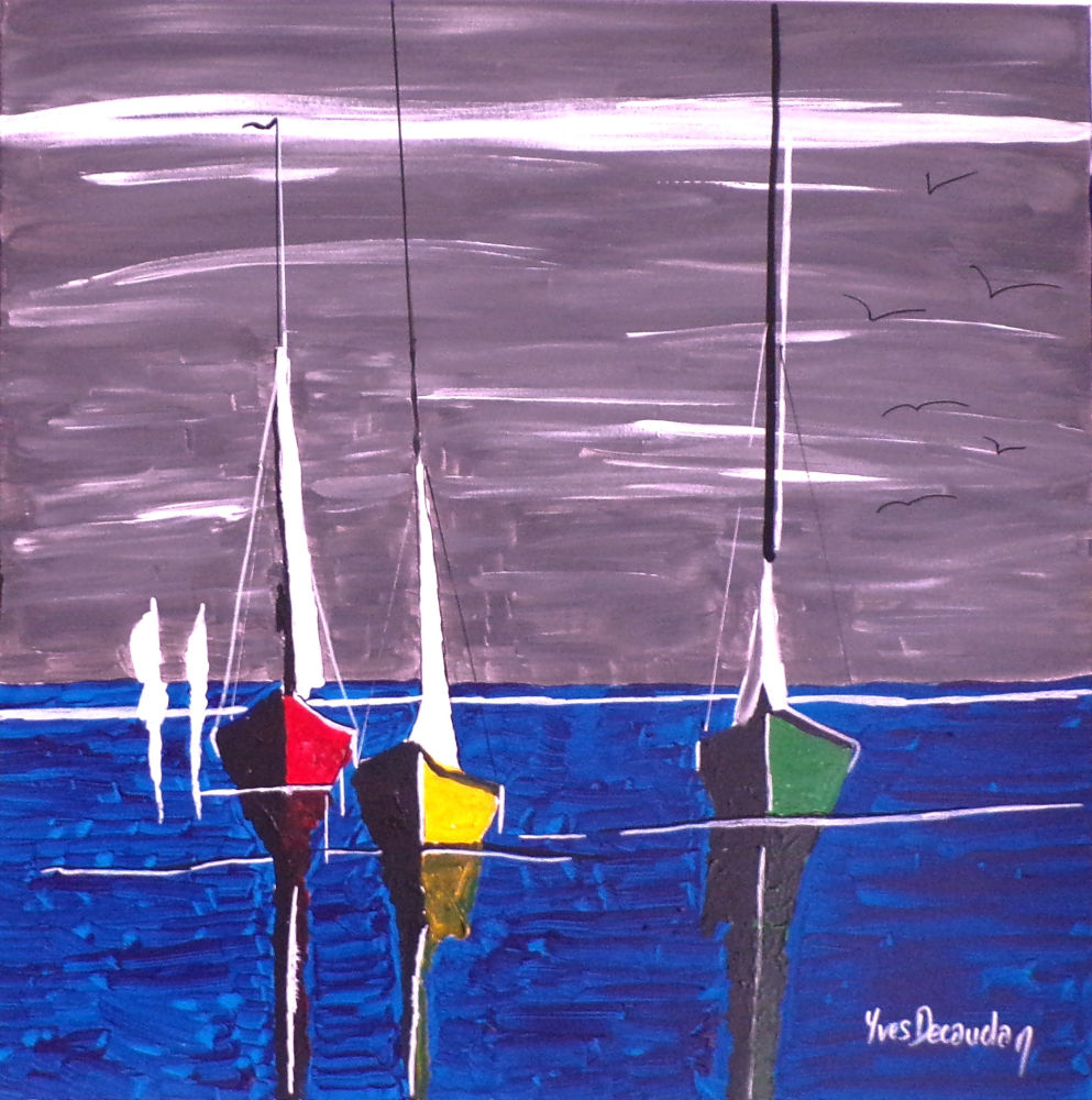 Cette œuvre d’Yves Decaudan, intitulée « Régate sous un ciel d’orage », est une composition marine qui allie minimalisme moderne et expressionnisme chromatique. : Le dessin est simplifié. Les oiseaux en haut à droite sont réduits à de simples traits en « V », et les bateaux sont représentés de manière stylisée, presque comme des icônes. On devine un travail à la spatule ou au couteau, particulièrement dans le rendu de l’eau, ce qui donne une texture riche et une certaine épaisseur à la peinture. Le tableau dégage une atmosphère de calme avant la tempête. Les couleurs vives des bateaux symbolisent une présence humaine joyeuse et résiliente face à l’immensité grise et menaçante de la nature. C’est une œuvre qui capture un instant suspendu, où le temps semble s’arrêter juste avant que le vent ne se lève.