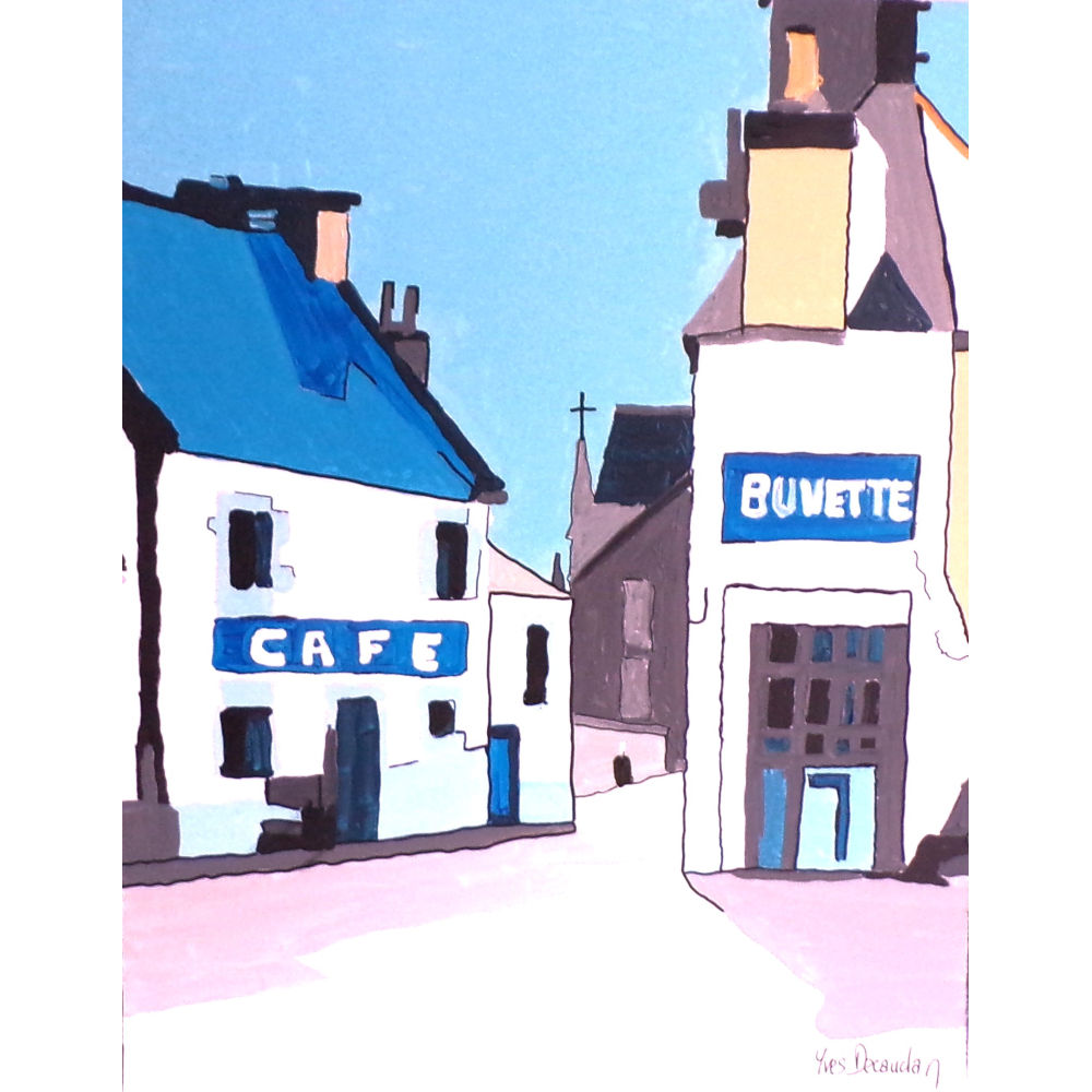 Ce tableau est une peinture au style naïf ou semi-figuratif, représentant dans une scène de rue un village breton du pays bigouden. L’ensemble dégage une impression de calme et de tranquillité. Le personnage et la simplicité des formes confèrent à l’œuvre une atmosphère intemporelle et charmante. C’est une représentation idéalisée et colorée de la vie de village, capturant l’essence des lieux à travers l’œil de l’artiste.